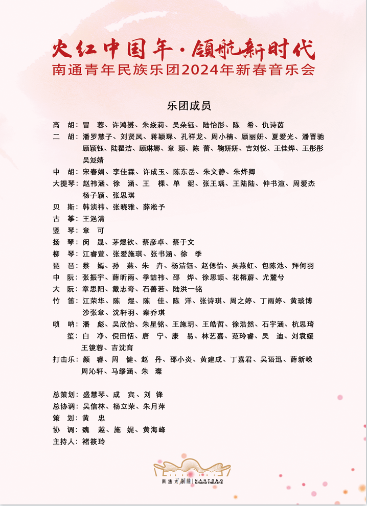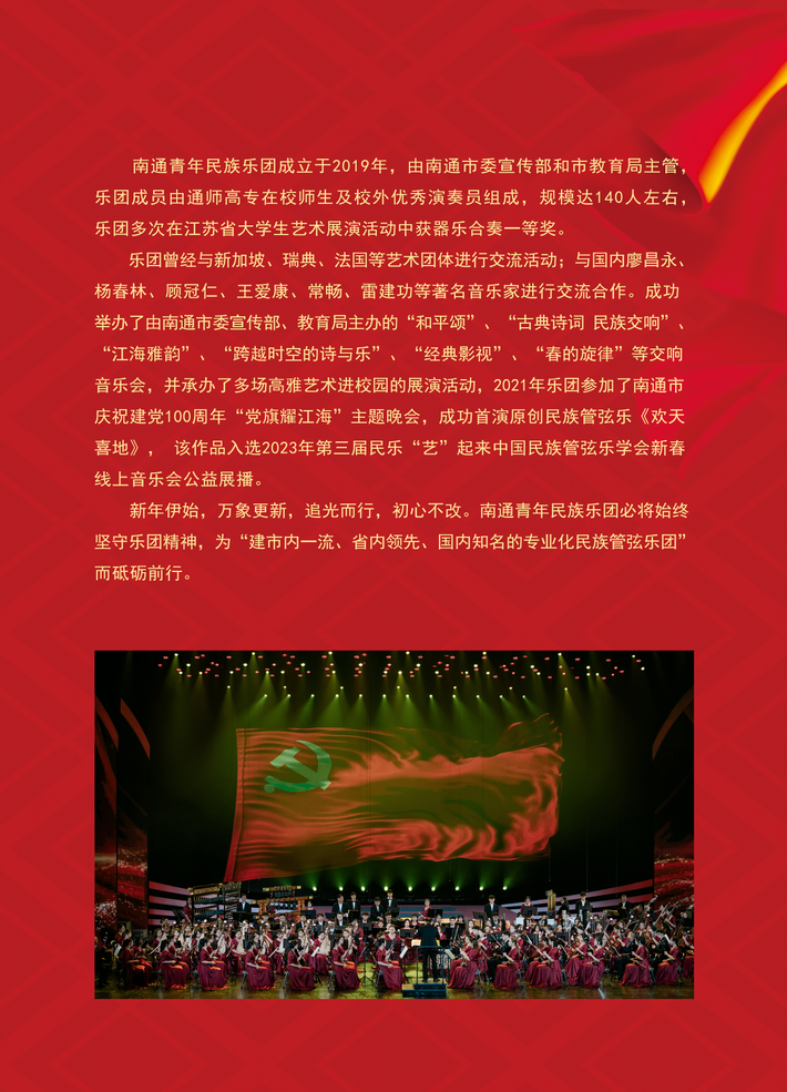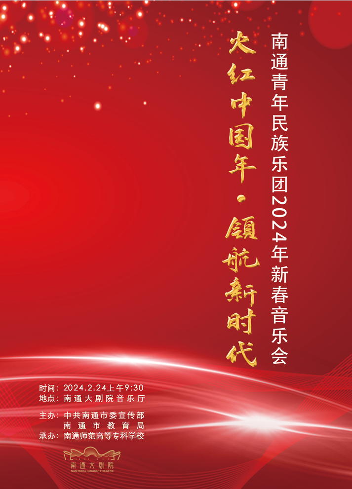 为迎接市委组织部、市教育主办的“火红中国年·领航新时代”南通青年民族乐团2024年新春音乐会,我院南通青年民族乐团师生利用假期时间,2月17日起即返校加紧高效排练,努力用较高艺术水准的民族管弦乐作品庆贺新春,同时进一步提升南通市民群众的整体艺术审美素养。
