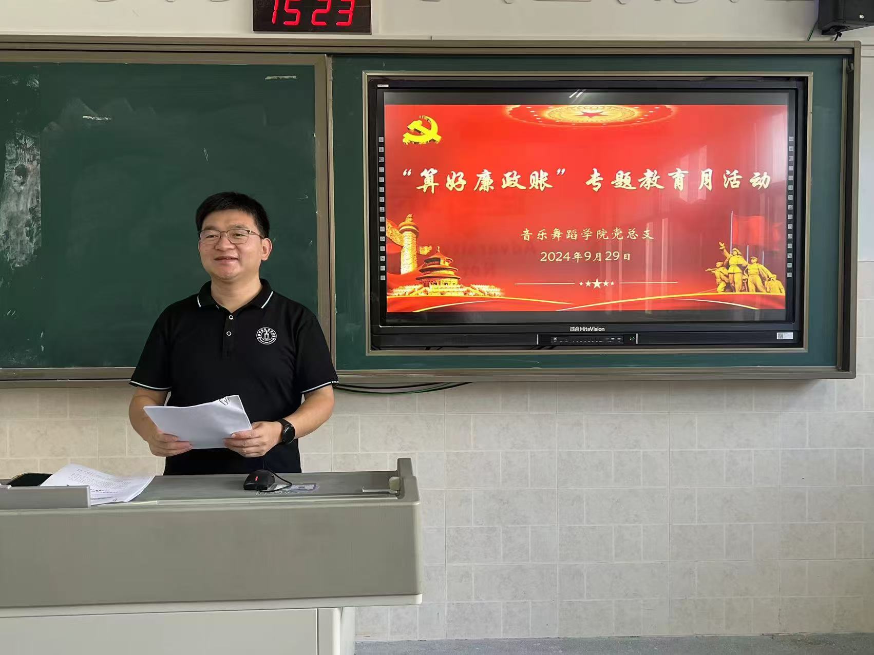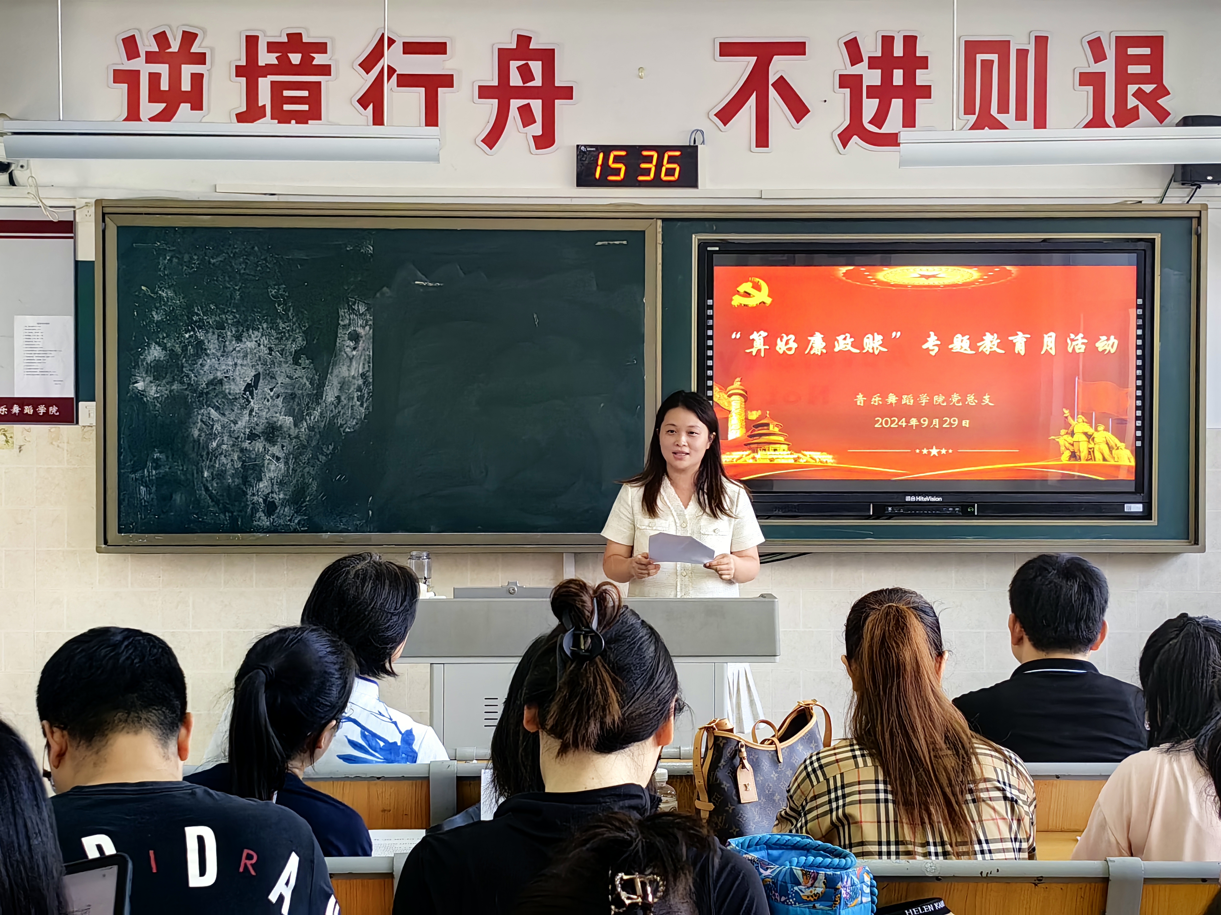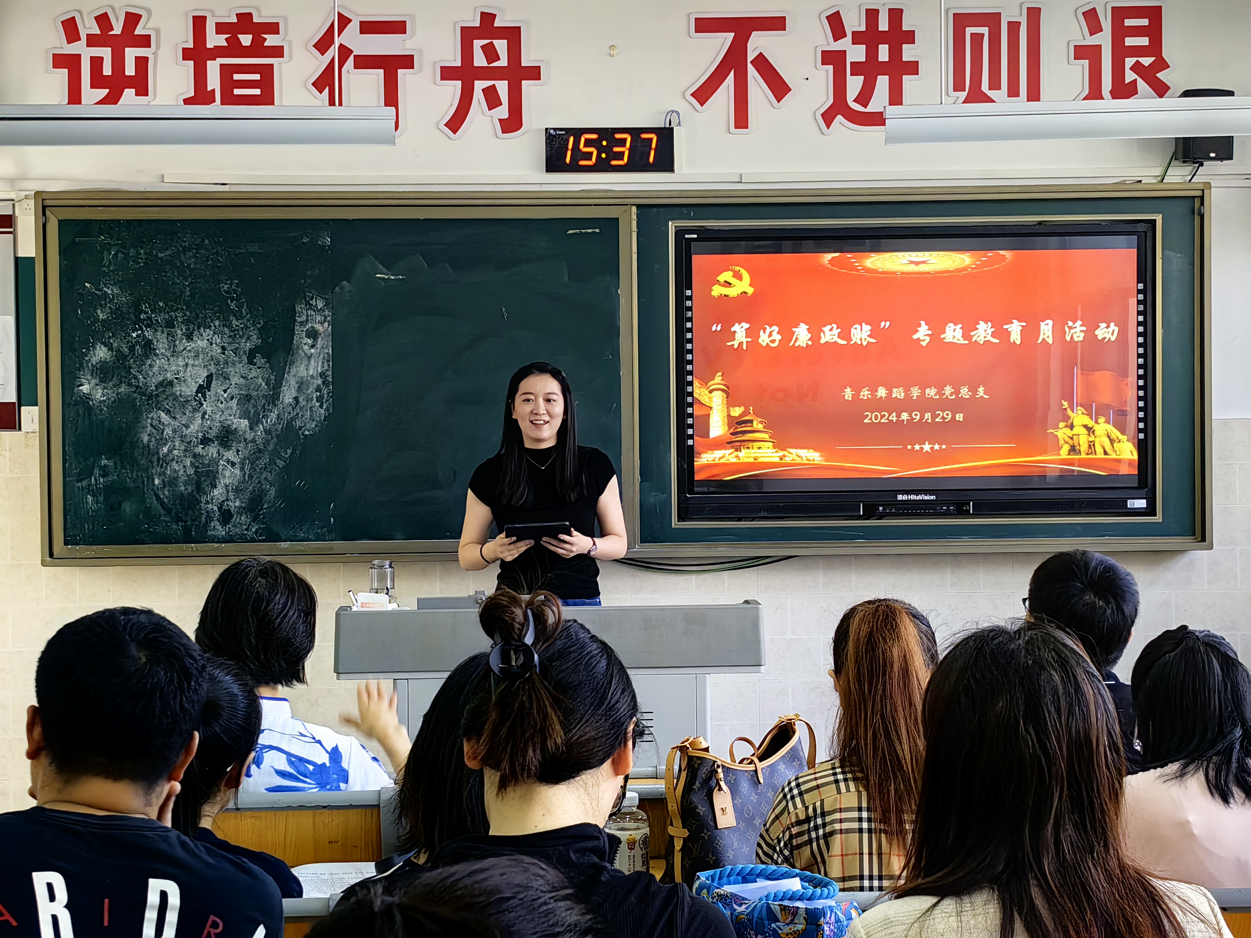 明道德以固本,重修养以强魄,祛贪欲以守节,知廉耻以净心。按照市纪委监委通纪发〔2024〕11 号文件精神和学校纪委工作部署,音乐舞蹈学院全体党员9月29日下午于尊素楼210教室开展了“算好廉政账”的专题教育活动。