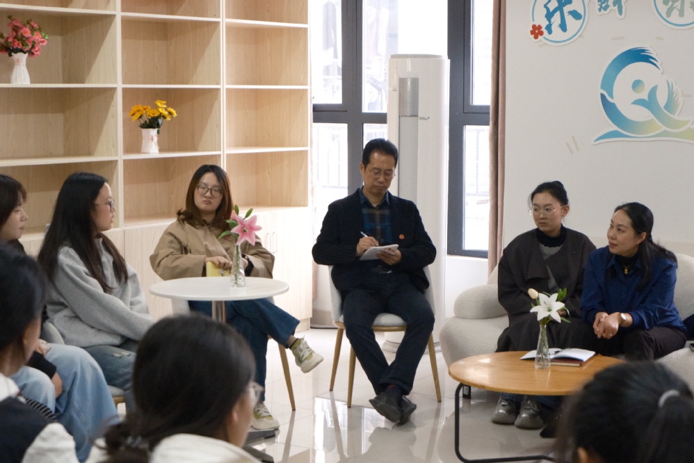为搭建高效畅通的师生沟通桥梁,精准倾听学生心声、回应成长需求,近日,我院在27号楼二楼辅导员之家隆重召开“我与党委书记面对面”座谈会。学校党委委员、组织部部长魏荣华、学院党总支书记成勇、专职辅导员钱慧锦与学生代表齐聚一堂,以面对面、心贴心的交流方式,共话校园发展蓝图,共解成长路上的困惑与难题。