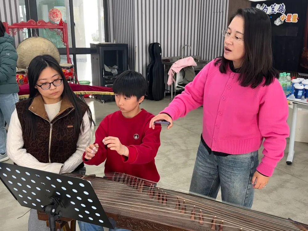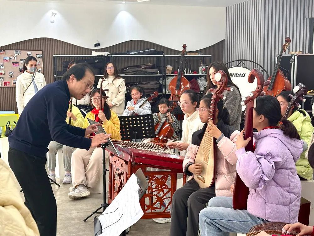 “民乐教育,技法是基础,而美育是灵魂。”指导过程中,我院老师们特别强调,美育的核心在于通过艺术实践激发学生的审美感知与情感共鸣。他们通过生动的比喻和形象的示范,将旋律的起伏、节奏的疏密转化为孩子们可感可知的情感语言,让每一次拨弦、每一次吹奏都不仅是对乐谱的复现,更是对音乐之美的主动探寻与表达。