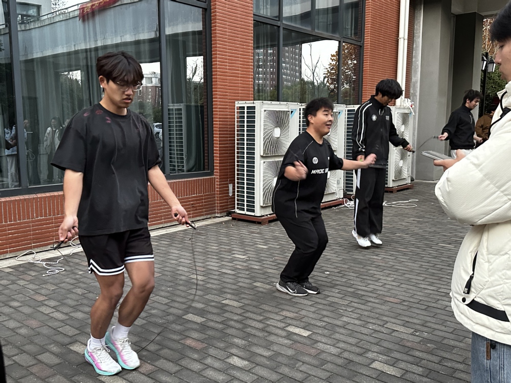 团体长绳项目更是将赛事氛围推向高潮。师生组队并肩作战,摇绳老师动作沉稳,长绳划出的圆弧稳定而有节奏;长绳起落间,同学们有序进入,跳跃整齐划一,如波浪般律动。师生们默契配合,鱼贯而入、轻盈跃动,身影在绳间穿梭如燕。“一二、一二”的口号声整齐响亮,回荡在场地的每一个角落,师生同心协力的身影,成为赛场上最温暖的风景线。
